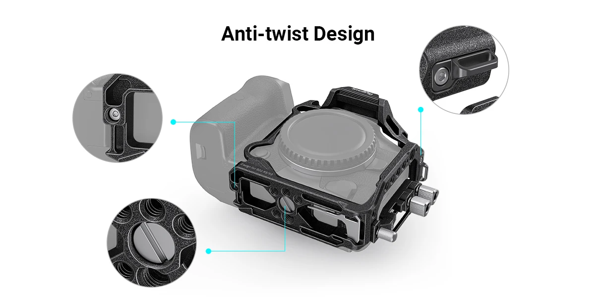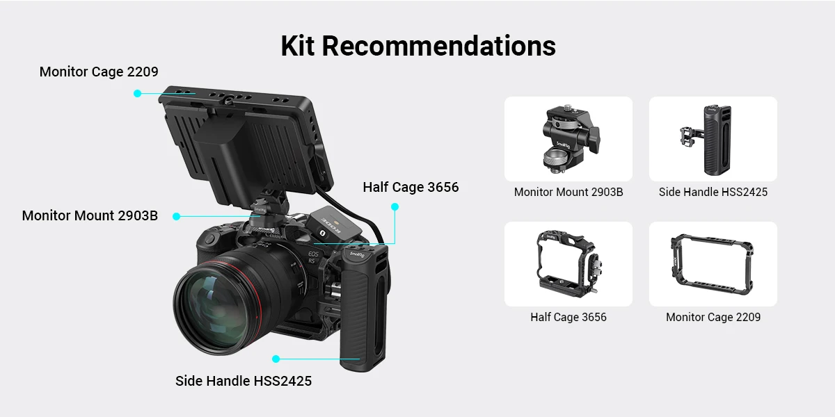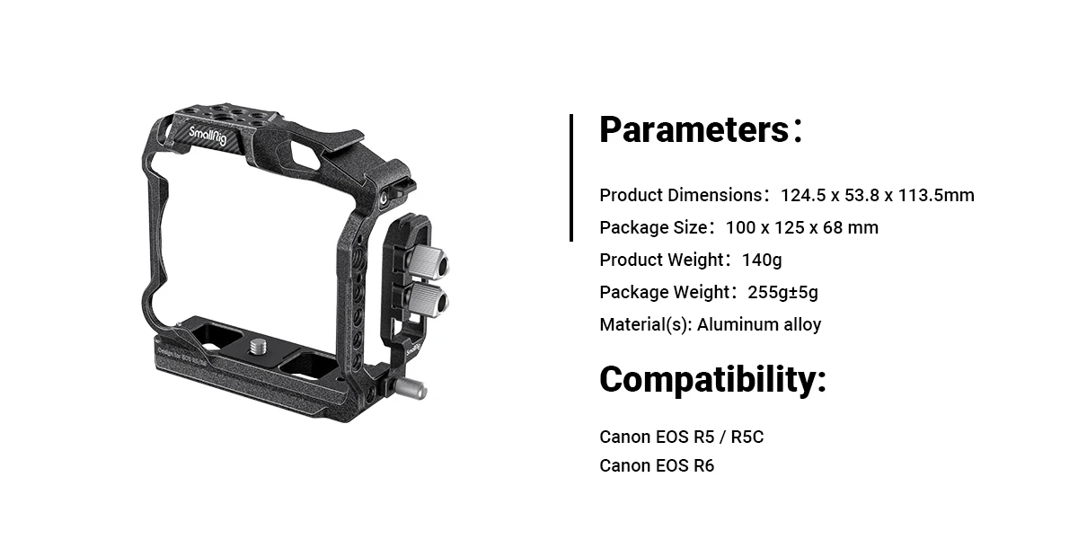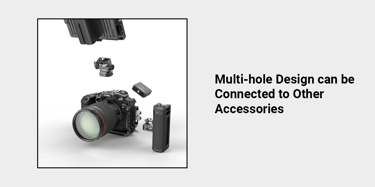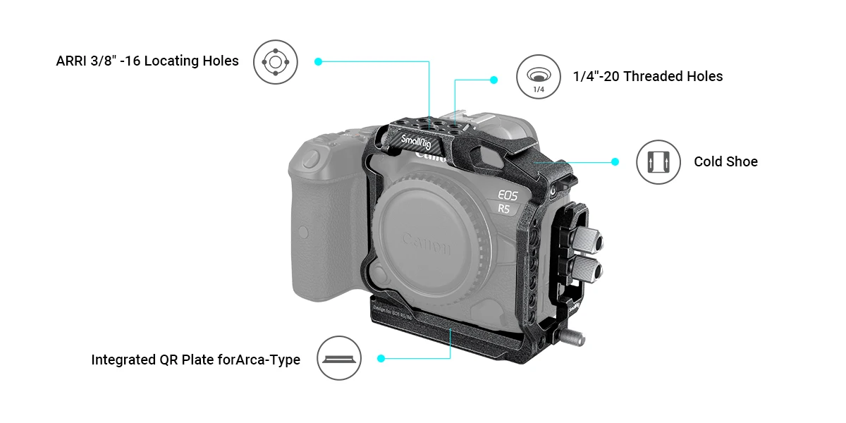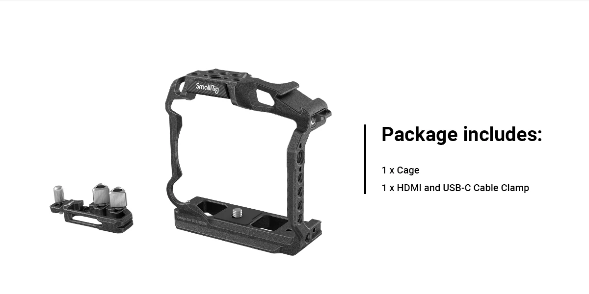 SmallRig “Black Mamba“ Camera Half Cage & Cable Clamp for Canon EOS R5&R5 C&R6 3656 is designed to leave the camera handgrip fully accessible and provide multiple accessory mounting points. The cage is locked with a 1/4" screw and a locating pin at the bottom and through the shoulder strap hole on the left side to prevent deflection. Silicone pads are built-in at several positions to protect the camera from scratches. The “Black Mamba” style is continued, maintaining full access to the camera’s controls. the cage feature multiple 1/4"-20, ARRI 3/8" -16 locating holes, cold shoes mount to attach accessories like Side Handle 2093, Top Handle 1984, magic arm 2070, microphone, light, and hand strap PAC2456. Integrated Arca-Type base directly compatible with DJI RS 2 & RSC 2 Gimbal to realize quick switch among RS 2, tripod and handheld shooting, and Built-in spanner on the bottom helps remove screws. The attached hand-tight HDMI & USB-C cable clamp to prevent accidental disconnection and ensure stable signal;